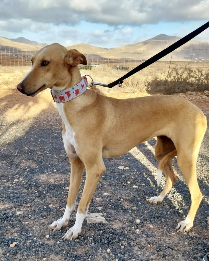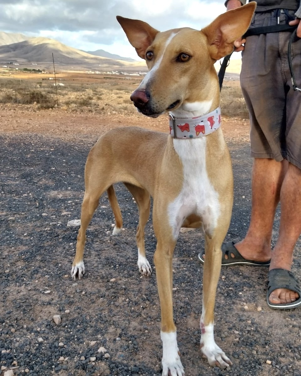 Die liebenswerte Podenca Foxy kam im Oktober 2024 nach zwei Jahren Perrera-Aufenthalt auf Fuerteventura in unsere Obhut und durfte auf unsere Insel-Pflegestelle zu Sara und Sven ziehen. Dort zeigte sie sich von Anfang an als freundliche, soziale und unkomplizierte Hündin.