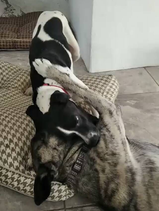 Nach kurzer Zeit passierte ein kleines Wunder. Der junge Bardinorüde des Pflegefrauchens ließ einfach nicht locker und lockte Lexa aus der Reserve. Sie wedelte das allererste Mal mit ihrer Rute und fing an sich ihm gegenüber zu öffnen und sogar zu spielen. Wir freuten uns wahnsinnig über diesen riesengroßen Fortschritt. Ab dem Tag an spielen die Beiden regelmäßig zusammen und Lexa ist im Spiel mit ihm sogar teilweise die dominantere. Wenn Lexa unbeobachtet ist, konnte das Pflegefrauchen (per Kameraüberwachung) sogar beobachten, dass Lexa alleine mit Spielzeug spielt und durch die Luft wirft. Sie teilst sich auch mit anderen Hunden der Pflegestelle ihr Kissen. Ihre Geschäfte erledigt sie größtenteils in einem kleinen für sie bestimmten Außenbereich.