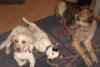 jetzt will ich mich auch nach langer Zeit mal wieder zu Wort melden.Immerhin bin ich jetzt schon 7 Jahre bei meinem Rudel. Zwar bin ich etwas grau um die Schnauze, aber sonst noch topfit.Seht ihr ja auf dem Bild, das bin ich vor einem Monat beim THS.. Auf dem anderen bin ich mit meinen zwei kleinen Kumpeln, der größere ist wie ich von Fuerte(der ganz große bin ich ). Leute, was soll ich sagen: ich drücke allen die noch ausharren müßen die Daumen das auch sie gut unterkommen
