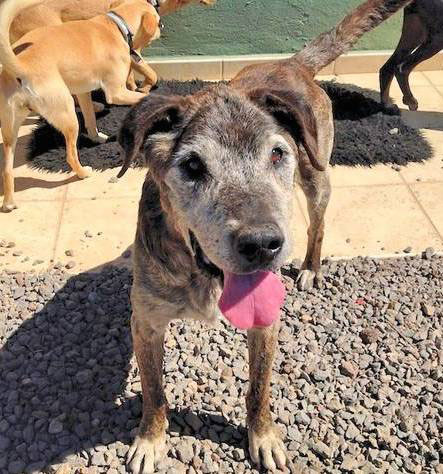 Bardino-Mix Taison fristete die ersten 11 Jahre seines Lebens an einer kurzen Eisenkette zur Bewachung von Kamelen in der Nähe eines touristischen Zentrums von Caleta.